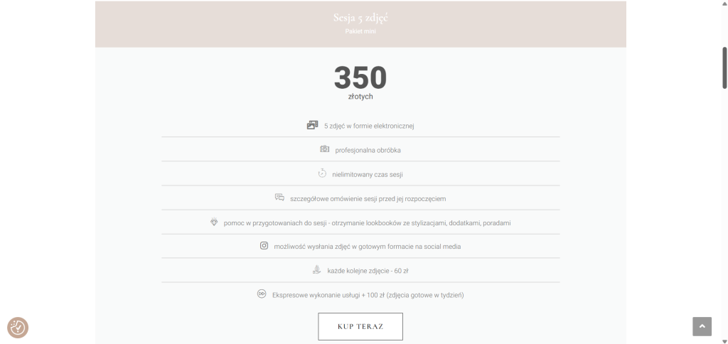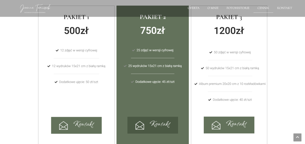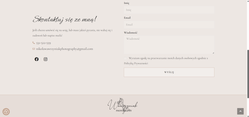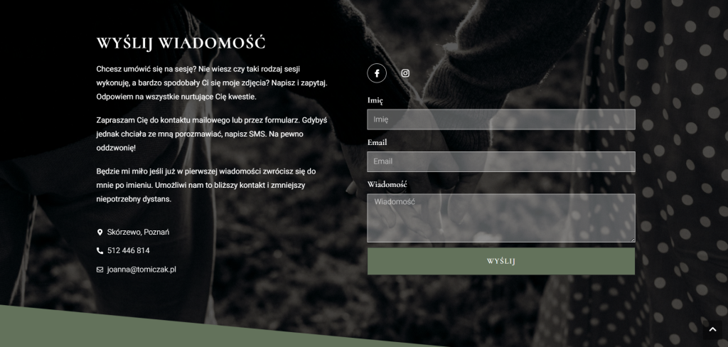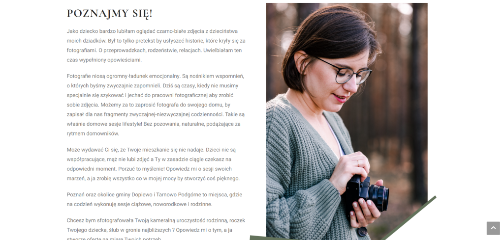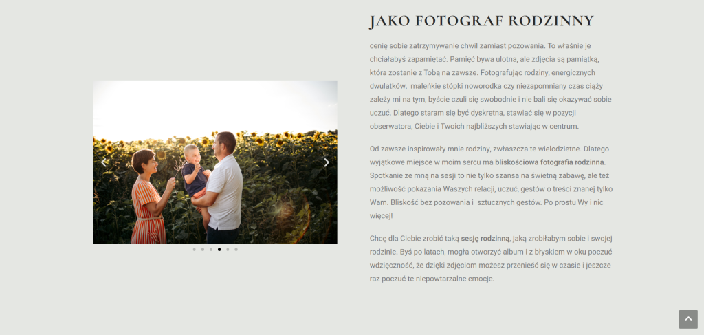 Strona zaprojektowana z myślą o subtelności i estetyce — jak jej zdjęcia. Stonowana kolorystyka podkreśla to, co najważniejsze: emocje uchwycone w kadrach. Każda sekcja to świadomy wybór, a każdy detal — odzwierciedlenie jej autorskiego podejścia. Bo magia tkwi w szczegółach, a każda sesja to osobna opowieść.