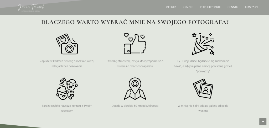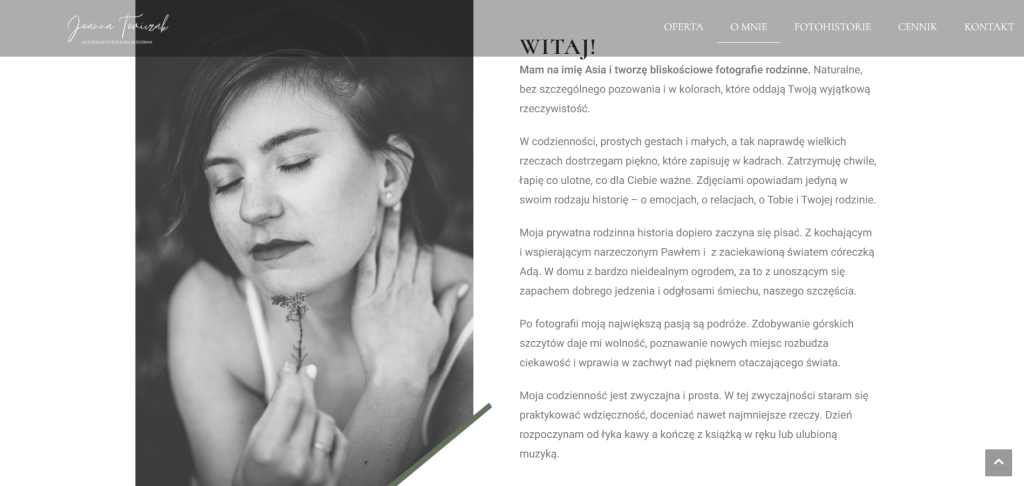 Projekt strony internetowej dla Pani Joanny Tomiczak to nasza wizja fotograficznego portfolio sesji rodzinnych, gdzie stawiamy priorytet na wartości wizualne.
