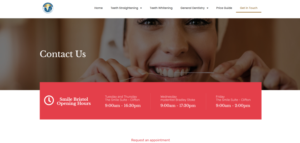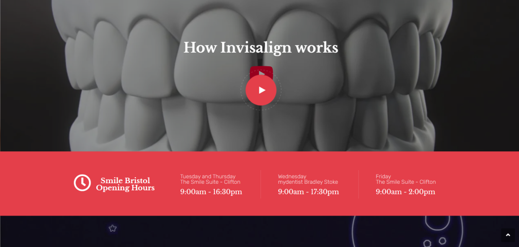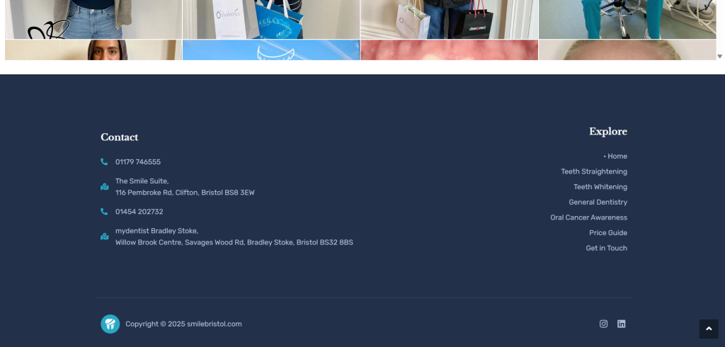 To moja autorska koncepcja i realizacja projektu głównej strony smilebristol.com – stworzonej z myślą o dwóch lokalizacjach kliniki (Clifton & Bradley Stoke), ze szczególnym naciskiem na prezentację leczenia alignerami i wizerunek profesjonalnego, ale przyjaznego środowiska stomatologicznego.